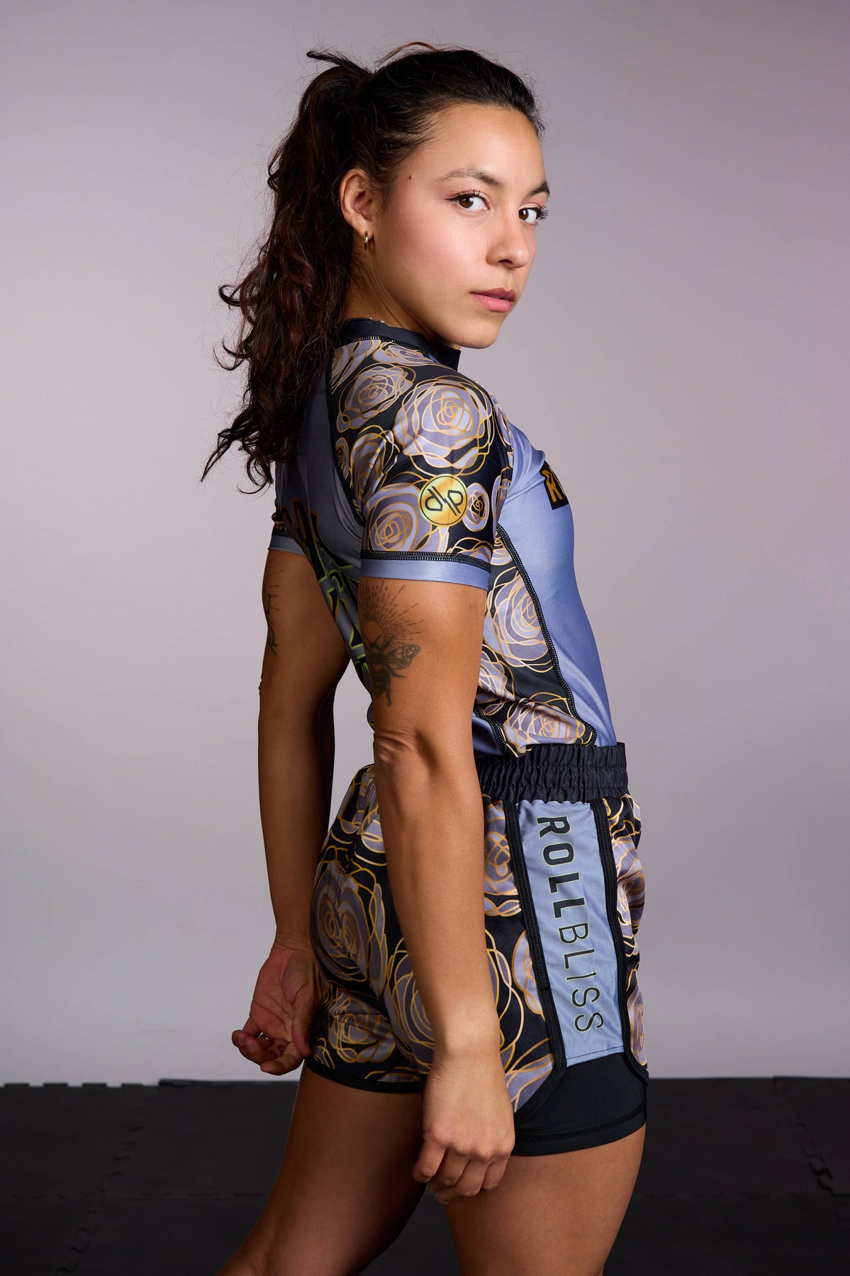 The RollBliss Psalms Collection Shorts fuse performance with refined artistry. Built for athletes who demand both durability and style, these shorts feature our signature black-and-gold rose pattern layered with soft grey tones a design that symbolizes strength blooming under pressure.